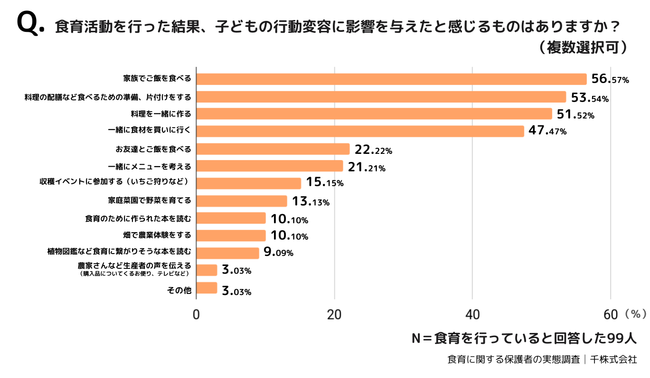 食育活動について、子どもの行動変容に影響を与えたと感じるものがあるか質問したところ、「家族でご飯を食べる(56.57%)」が最も多く「料理の配膳など食べるための準備、片付けをする(53.54%)」「料理を一緒に作る(51.52%)」と続く結果になりました。