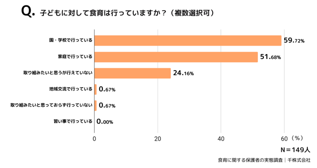 子どもに対して食育を行っているか質問をしたところ、「園・学校で行っている(59.06%)」が最も多く「家庭で行っている(51.68%)」「取り組みたいと思うが行えていない(24.16%)」「地域交流で行っている(0.67%)」「取り組みたいと思っておらず行っていない(0.67%)」と続く結果になりました。