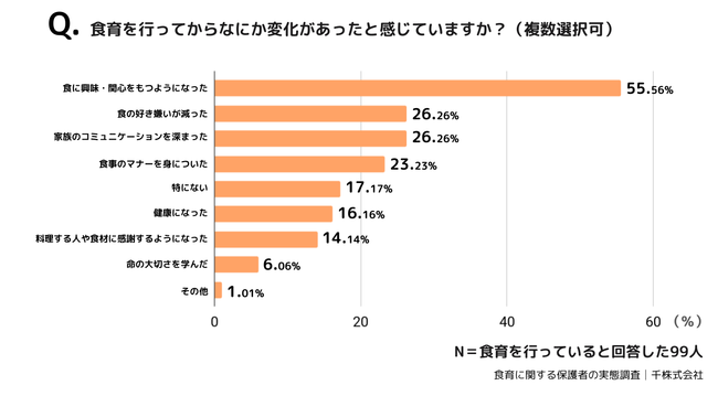 また、食育を行ってからなにか変化があったと感じていますか?と質問したところ「食に興味・関心をもつようになった(55.56%)」が最も多く「食の好き嫌いが減った(26.26%)」「家族のコミュニケーションが深まった(26.26%)」が続く結果になり、約8割の保護者が食育の取り組みが子どもに変化をもたらしていると実感していることが分かりました。