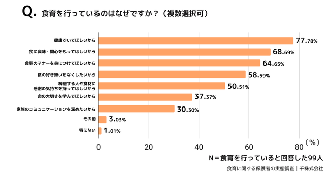 食育を行っていると回答した人に、食育を行っているのはなぜですか?と質問したところ、「健康でいてほしいから(77.78%)」が最も多く「食に興味・関心をもってほしいから(68.69%)」「食事のマナーを身につけてほしいから(64.65%)」が続く結果となりました。