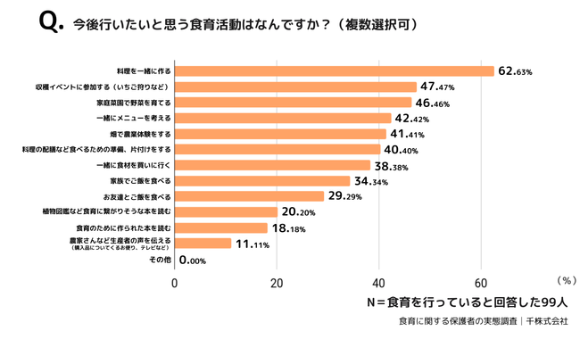今後行いたいと思う食育活動について質問したところ、「料理を一緒に作る(62.63%)」が一番多く、次いで「収穫イベントに参加する(いちご狩りなど)(47.47%)」「家庭菜園で野菜を育てる(46.46%)」が多い結果で、実際に調理したり、野菜や果物に触れるなどの「体験」を行わせたい傾向が強いと言えそうです。
