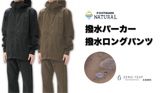 フットマーク株式会社(本社:東京都墨田区、代表取締役社長:三瓶 芳)は、アウトドアブランド「FOOTMARK NATURAL(以下、フットマークナチュラル)」から「撥水パーカー」と「撥水ロングパンツ」を発売いたします。洗濯しても撥水が落ちにくい耐久撥水加工が施されたZERO-TEX(R)️生地を採用した、普段も使用したくなるスマートなデザインと高機能を実現したレインウェアです。カラーはブラックとブラウンの2色展開、サイズは、メンズ規格でM~LLの3サイズの展開。価格は、パーカーが15,400円(税込小売希望価格)ロングパンツが9,900円(税込小売希望価格)です。スポーツ量販店等で販売いたします。