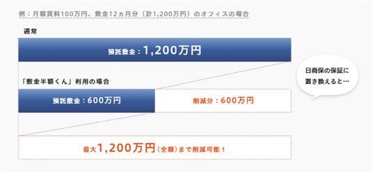 日商保の「敷金減額サービス」は、オフィス入居時の敷金を「保証」と置き換えることで、敷金を半額~最大ゼロ円にします。サービス利用料は、削減した敷金額の5% / 年です。利用にあたっては、日商保独自の審査の通過及びビルオーナーの許諾が必要となります。