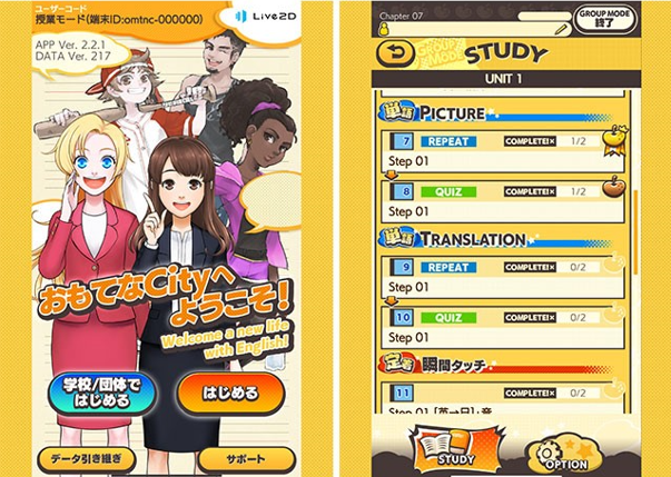 カルタ取りのように問題を聞きながら、正解の単語を選ぶ単語学習「瞬間タッチ」や、教科書に沿った学年別コンテンツで会話をシミュレーションできる「会話シミュレーション」など、豊富なコンテンツを取り揃え、まるでゲームをするような感覚で英語・英会話を自学できます。