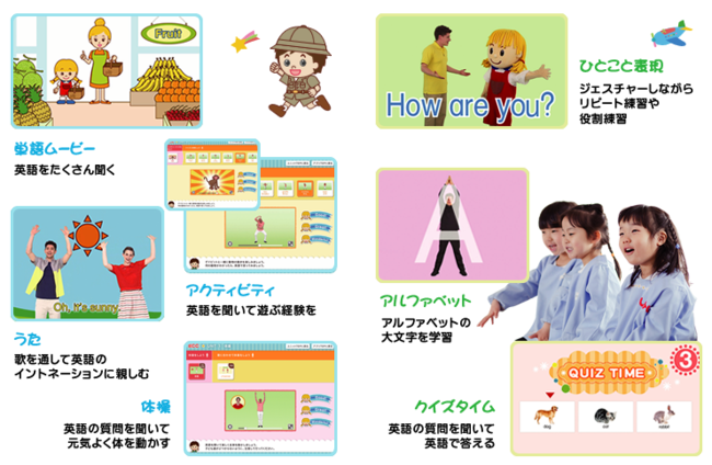英語を聞きながら体を動かしたり、歌を通して英語独特のリズムを覚えたり、音声やキャラクターの映像を使ったりして、ICTによるALT(外国語指導助手)がいるレッスンと同様のプログラムを収録しています。