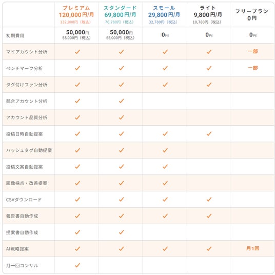 今回リリースされた、AIによる戦略・投稿テーマの企画機能は、フリープランでも月に1回だけ使用することができます。なお、有料プランでは毎日1回使用する事ができます。さらに、AIによる写真の改善提案機能、及び投稿分生成機能は、初期費用0円、月額29,800円(税別)のスモールプラン以上のプランでご利用頂けます。