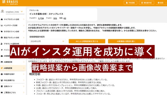 これまでのGRASISには、スナップレイスのAIを使った投稿画像のSNS映度合いの採点と改善提案、及び生成AIと分析ツールを活用した投稿文・ハッシュタグ案自動提案、投稿日時自動提案、自動で毎月の運用報告レポートを生成する機能などが実装されていました。しかし、その分析データを下に、総合的にアカウント運用の課題をあぶり出し、改善案を提案し、翌月の投稿案を企画する機能はございませんでした。この度、運用戦略・企画までAIによってデータに基づいた企画提案ができるようになったことで、従来SNS運用担当者や広告代理店担当者が行っていた運用戦略立案・企画業務までもスナップレイスのインスタ運用・分析ツール「GRASIS」で実現できるようになります。