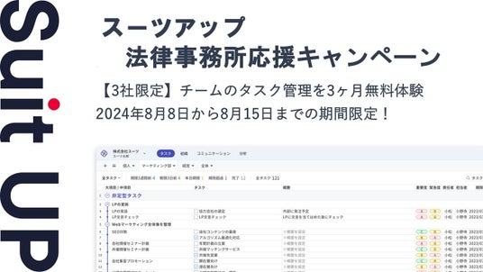株式会社スーツ(所在地:東京都千代田区、代表取締役社長CEO:小松 裕介)は、チームでかんたん、毎日続けられるプロジェクト・タスク管理ツールの経営支援クラウド「Suit UP」(スーツアップ)において、法律事務所応援キャンペーンを実施いたします。