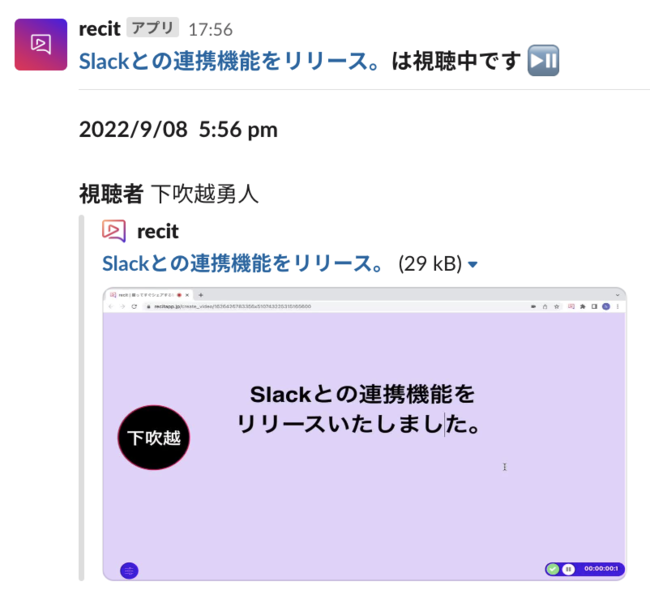 手順に従ってお使いのSlackワークスペースと連携していただくと、recitに動画が追加された際や、視聴・コメント及びコメントへの返信時に、自動でSlack上に通知が行われます。