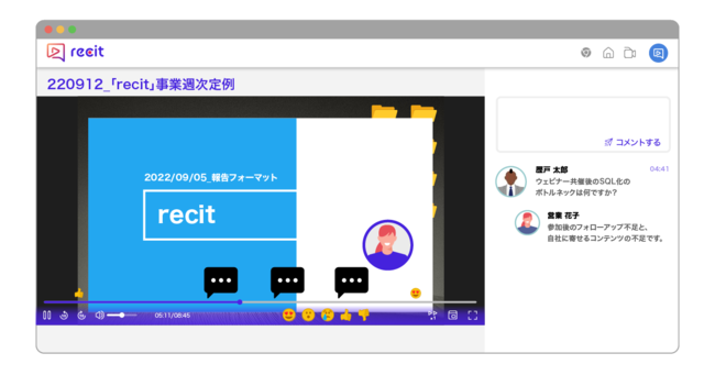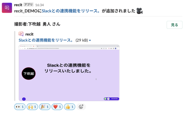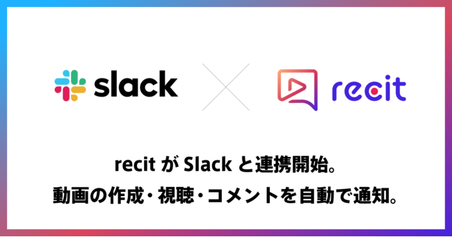 recitは2クリックで撮影開始、録画終了後10秒で共有できる動画メッセージツールです。Slack連携アプリのリリースにより、動画の作成、視聴、コメントの即時通知を実現し、Slackを活用されている企業様の動画活用を促進します。