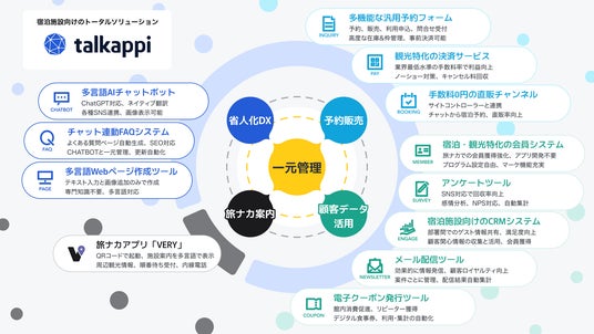 talkappiは、観光分野に特化したAI活用の顧客体験プラットフォームで、観光・宿泊施設にトータルソリューションを提供いたします。1,300施設以上に導入実績があり、利用継続率は98%以上。日本の代表的なホテルや旅館・観光自治体・観光体験事業者が多く利用しています。