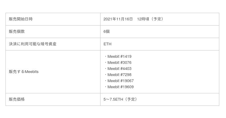 ~ 取扱い開始を記念し、世界に994個しかないTattooを持つMeebitsなど、6個のMeebitsを11月16日より販売 ~
