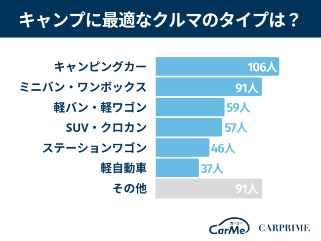 キャンプに最適なクルマのボディタイプでは、キャンピングカーが106人(21.8%)で最多となっています。その名の通り、キャンプのためのクルマですから妥当だと言えるでしょう。キッチンやお手洗いが付いているものもありますし、非常に便利なクルマです。