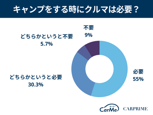 調査の結果、300人のうち55%(165人)がキャンプにクルマは必要だと回答、30.3%(91人)もどちらかというと必要と回答しました。合わせて8割以上の方がキャンプにクルマが必要だと考えているようです。やはり荷物を持ってキャンプ場まで行くには、クルマの方が便利そうですよね。