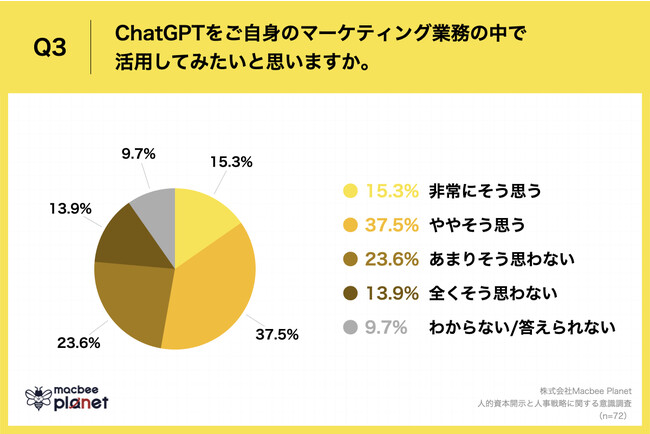 Q1で「ない」と回答した方に、「Q3.ChatGPTをご自身のマーケティング業務の中で活用してみたいと思いますか。」(n=72)と質問したところ、「非常にそう思う」が15.3%、「ややそう思う」が37.5%という回答となりました。