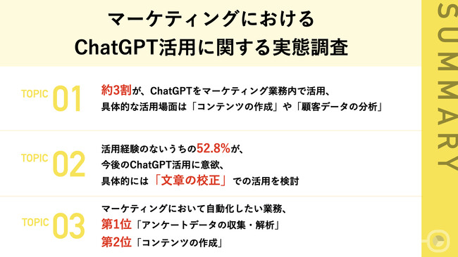 今回の調査では、マーケティングのあらゆる場面で活用可能なChatGPTについて、まだまだ理解が深まっておらず、なかなか実務に活かすことができていない現状が明らかとなりました。活用できた際には、オペレーションの効率化が図れるという可能性を感じた方も多かったため、ChatGPTについてしっかりと理解し、業務に活用するイメージを持つことから始める必要がありそうです。まずは、活用事例などに触れて理解を深め、自身の些細な業務に活かすところから導入を検討してみてはいかがでしょうか。