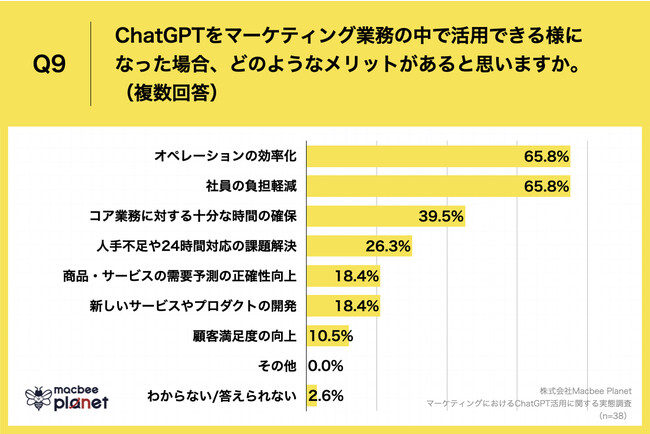 Q3で「非常にそう思う」「ややそう思う」と回答した方に、「Q9.ChatGPTをマーケティング業務の中で活用できる様になった場合、どのようなメリットがあると思いますか。(複数回答)」(n=38)と質問したところ、「オペレーションの効率化」が65.8%、「社員の負担軽減」が65.8%、「コア業務に対する十分な時間の確保」が39.5%という回答となりました。