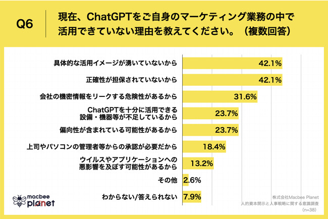 Q3で「非常にそう思う」「ややそう思う」と回答した方に、「Q6.現在、ChatGPTをご自身のマーケティング業務の中で活用できていない理由を教えてください。(複数回答)」(n=38)と質問したところ、「具体的な活用イメージが湧いていないから」が42.1%、「正確性が担保されていないから」が42.1%、「会社の機密情報をリークする危険性があるから」が31.6%という回答となりました。