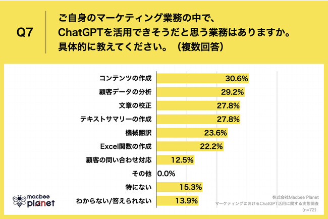 Q1で「ない」と回答した方に、「Q7.ご自身のマーケティング業務の中で、ChatGPTを活用できそうだと思う業務はありますか。具体的に教えてください。(複数回答)」(n=72)と質問したところ、「コンテンツの作成」が30.6%、「顧客データの分析」が29.2%という回答となりました。
