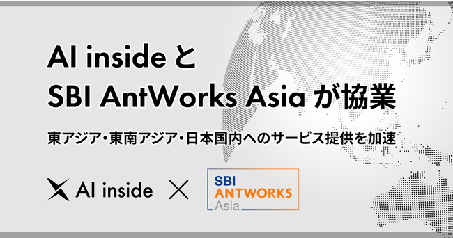 AIプラットフォームを提供するAI inside 株式会社(代表取締役社長CEO:渡久地 択、本社:東京都渋谷区、以下「AI inside」)と、SBI AntWorks Asia株式会社(代表取締役:横山 宏明、本社:東京都港区、以下「SBI AntWorks Asia」)は、「Technology Partner」としてパートナーシップ締結に合意したことをお知らせします。それぞれの強みを活かし東アジア圏や東南アジア圏のグローバル企業や日本国内外の日系企業等のAI活用とDXを後押しします。