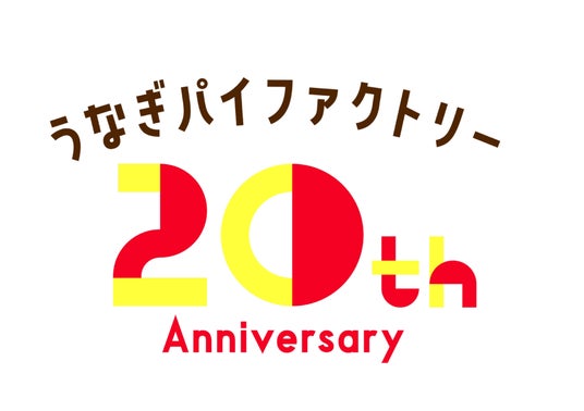 20周年のロゴデザインうなぎパイファクトリーのクラフト感をイメージした図形を組み合わせたデザイン。うなぎパイのロゴにも使われている、元気いっパイな赤色と黄色をあしらいました。新CMのほか、うなぎパイファクトリー館内の装飾等に使用されます。