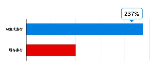 人物の登場する素材において、既存の写真やイラスト素材を用いたバナー広告に対し、AIプラットフォームを活用して生成した人物素材を使ったバナー広告は、クリック率で2.37倍の差を記録。これにより、広告クリエイティブの制作において、従来の手法に対して優位性を発揮できることが確認されました。