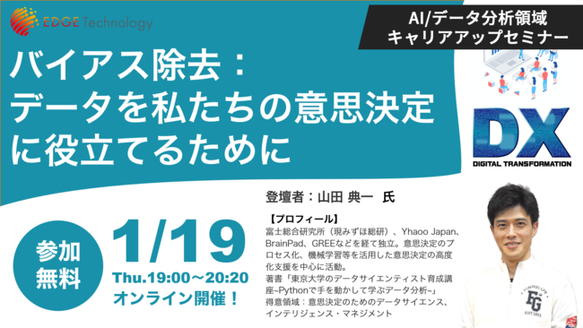 エッジテクノロジー株式会社の技術顧問である山田典一氏より、「バイアス除去:データを私たちの意思決定に役立てるために」セミナーを無料講演いたします。