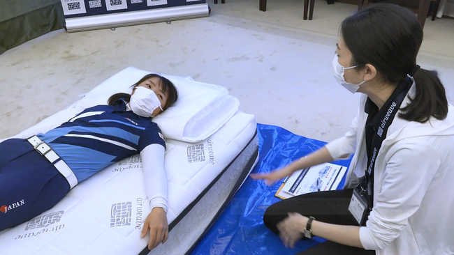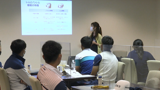 合宿先にて、睡眠セミナーや寝具のフィッティングを実施。体形測定システム「エアウィーヴ マットレス・フィット」を使用して選手の体形を測定し、カウンセリングを通して一人ひとりに最適な寝具を選んでいただきました。また選手のパフォーマンス向上に向け、睡眠カウンセラーによるセミナーを実施し質の良い睡眠のとり方などについてお伝えしました。