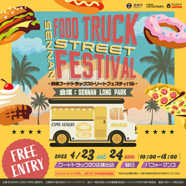 株式会社トライハードジャパン(所在地:大阪市中央区)は、2022年4月23日(土)24日(日)に、SENNAN LONG PARK(所在地:大阪府泉南市)にて、グルメイベント「FOOD TRUCK STREET FESTIVEAL」を開催いたします。