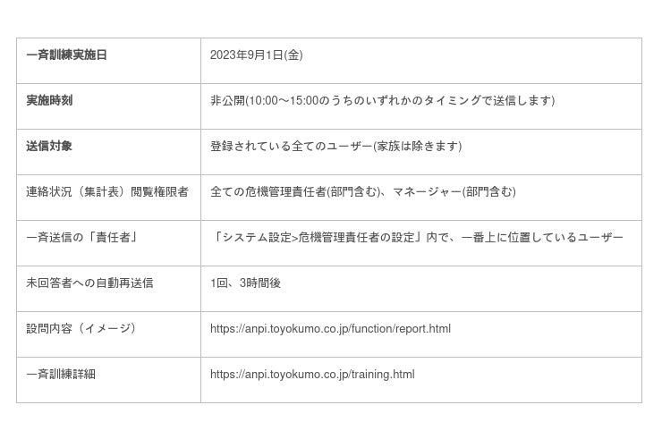 安否確認サービス2をご利用いただいているお客様に対して、トヨクモが主体となって行う実践に近い形式の訓練です。