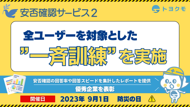 トヨクモ株式会社(本社:東京都品川区、代表取締役社長:山本 裕次、以下「トヨクモ」)は、関東大震災からちょうど100年の2023年9月1日に企業向けの安否確認システム「安否確認サービス2」を契約中のユーザーに向けて、全ユーザー同時の一斉訓練を実施することをお知らせします。また、参加団体の安否確認の回答率や回答のスピードを集計し、優秀企業には「Good安否確認賞」を表彰します。