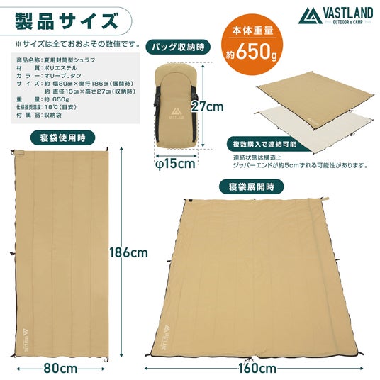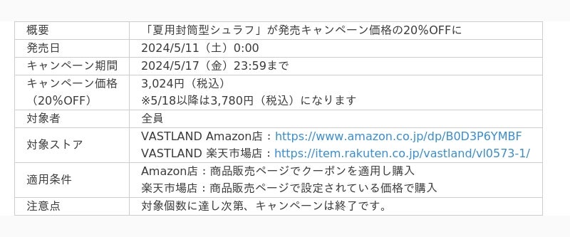 VASTLAND株式会社(本社:兵庫県姫路市/代表:田中悠貴)が運営するキャンプギアブランド「VASTLAND(ヴァストランド)」は、サマーシーズンに快適な生地を使用した軽量コンパクトな「夏用封筒型シュラフ」を2024/5/11(土)にAmazon店&楽天市場店で先行発売しました。また発売を記念して、Amazon店&楽天市場店限定で20%OFFの価格で購入できる「発売キャンペーン」を開催します。