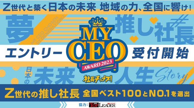 社長チップスエンタテイメント株式会社(所在地:東京都渋谷区、代表取締役会長:西川世一)は、Z世代の “推し社長” (おししゃちょう=MY CEO)を発掘するアワード「MY CEO AWARD 2023(マイシーイーオーアワード)」のエントリーを開始しました。BEST100、エリアごとの1位(FINALIST 7)、各賞が書類審査で決定。FINALISTに選ばれた7人は本選大会で夢ピッチを行い会場のZ世代投票によりCHAMPIONが決定します。また、BEST100に選ばれた社長の社長カードは、アワード後<社長かるた>として商品化されることになっています。