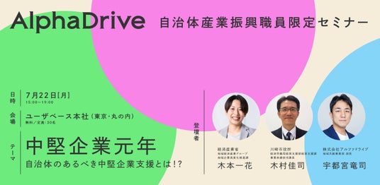株式会社アルファドライブ(以下、AlphaDrive)は、株式会社ユーザベースが運営するNewsPicks Re:gionと協力し、自治体の産業振興関連部署で働く職員向けに、地域経済・産業振興のトレンドである「中堅企業」について、支援のあり方を学び、議論するセミナーを7月22日(月)に開催いたします。