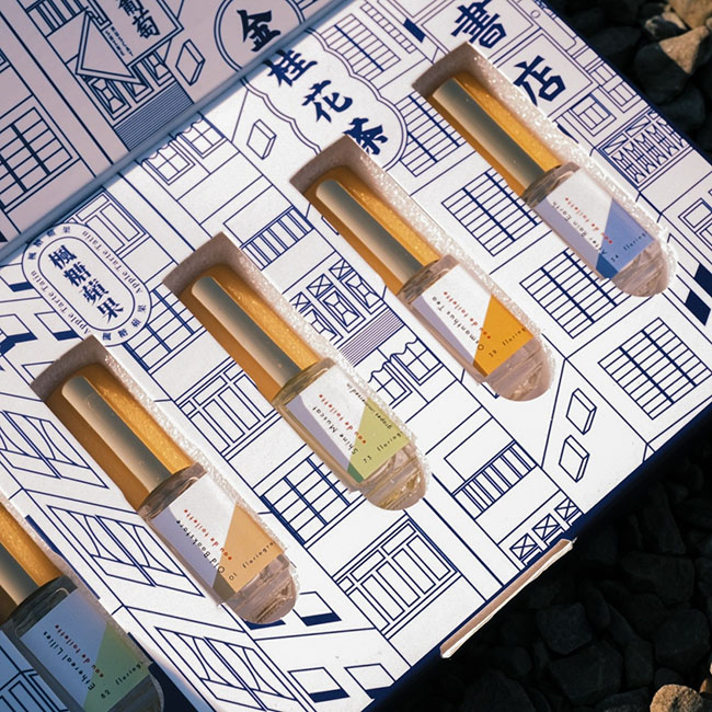 金木犀茶、アップルパイ、雨上がりの空気、街角の古本屋などをイメージした、14種類のユニークな香りから好きな5種類を選べるミニサイズの香水セット。香港の街並みが描写された、おしゃれなギフトボックスで届きます。