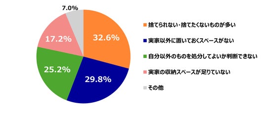 実家の荷物整理に関して困ることを尋ねると、最も多い回答は、「捨てられない・捨てたくないものが多い」(32.6%)、続いて「実家以外に置いておくスペースがない」(29.8%)、実家ならではの悩みである「自分以外のものを処分してよいか判断できない」(25.2%)、「実家の収納スペースが足りていない」(17.2%)という結果になりました。自宅のスペースなどの不足から実家に置いているケースやそもそも実家についても収納スペースが足りていないため悩んでいる方がいることがわかります。