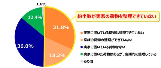 実家の荷物について尋ねたところ、「実家に置いている荷物は整理できていない」が約3割(31.8%)、「家族の荷物の整理ができていない」が約2割(18.2%)という結果になりました。実家の荷物の整理ができていない方の合計は、約5割(50.0%)となることが明らかになりました。