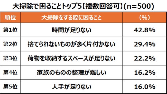 大掃除の際に困ることを調査したところ、最も多い回答は、「時間が足りない」(42.8%)、続いて「捨てられないものが多く片付かない」(29.4%)、「荷物を収納するスペースが足りない」(22.2%)という結果になりました。まとまった時間をなかなか取れないことや、捨てられないものが多いこと、自宅の収納スペースの不足が大掃除へのハードルとなっていることがわかりました。