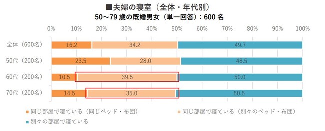 ⇒夫婦の寝室は、「同じ部屋(同じベッド・布団で寝ている)(16.2%)」「同じ部屋(別のベッド・布団)(34.2%)」「別の部屋で寝ている(49.7%)」となる。60代以上になると、同じ部屋でも別のベッド・布団が約4割に増加。