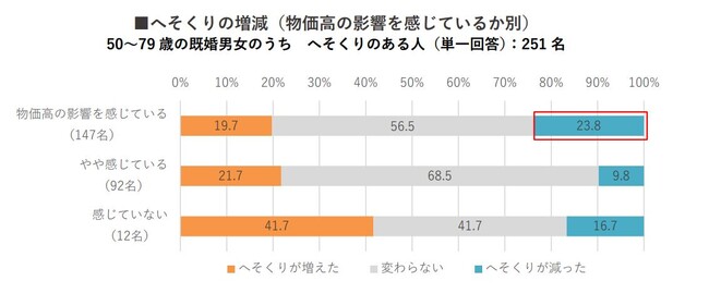 ・へそくりが減った理由は「突発的な出費」が最多だが、「物価高で欲しいものが高かった」など、物の価格が高騰して出費がかさんだことなどがうかがえる。また、物価高の影響を感じている人は、へそくりが減った人が多い。