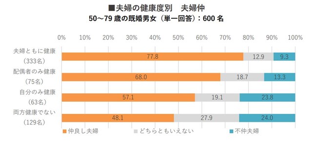 ・夫婦ともに健康な人の約8割が仲良し夫婦。健康な夫婦ほど仲良し夫婦の割合が高い。