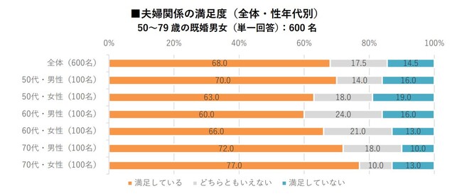⇒夫婦関係の満足度は全体平均で68.0%。50代女性・60代男性でやや満足度が低く、一方70代男女は高い。