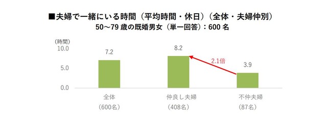 ⇒夫婦が一緒にいる時間は、休日で平均7.2時間。仲良し夫婦は8.2時間で、不仲夫婦の2倍以上。