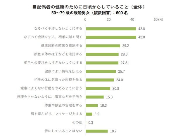 ・相手の健康のためにしていることは、「干渉しないようにする」「なるべく会話をする」こと。次いで、「健康診断結果を確認する」「顔色や体の様子を確認する」など、相手の体調を確認すること。