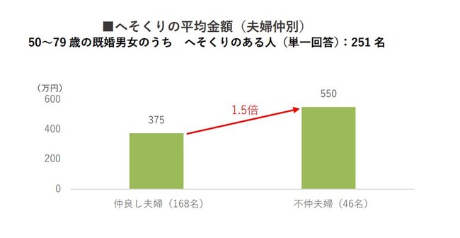 ・また、不仲夫婦のへそくり額は550万円となり、仲良し夫婦の約1.5倍に上る。