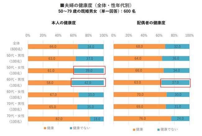 ・夫婦関係の満足度が低い50代女性、60代男性は、健康でない割合が高い。特に、60代男性は本人に加えて配偶者も健康でない割合が高い。