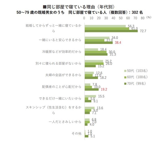 ⇒同じ部屋で寝ている理由は、「結婚してからずっと一緒に寝ているから」が最多。70代では「配偶者のことが心配だから」「安心できるから」が増加し、「何かあった時に対応出来るから」などの理由があがる。