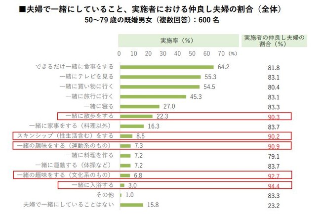 ⇒夫婦一緒に行っていることは、「できるだけ一緒に食事をする」「テレビを見る」「買い物に行く」。夫婦仲が良い人ほど「一緒に散歩」「一緒の趣味」「一緒に入浴」など、一緒に行動をしていることが多い。