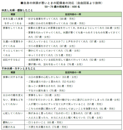 ・仲良し夫婦ほど、具合の悪い時に「配偶者がよくしてくれる」と回答。仲良し夫婦が、自分の具合が悪い時に感謝したことは、「体調に合わせた料理を作ってくれること」「家事をしてくれること」「気遣いの言葉をかけてくれること」など。一方、不仲夫婦がカチンときたことは、「脂っこい食事を出された」や「自分の食事の心配しかしない」など食に関することや、「自分の行動を変えない」「心配してくれない」「非難される」など。