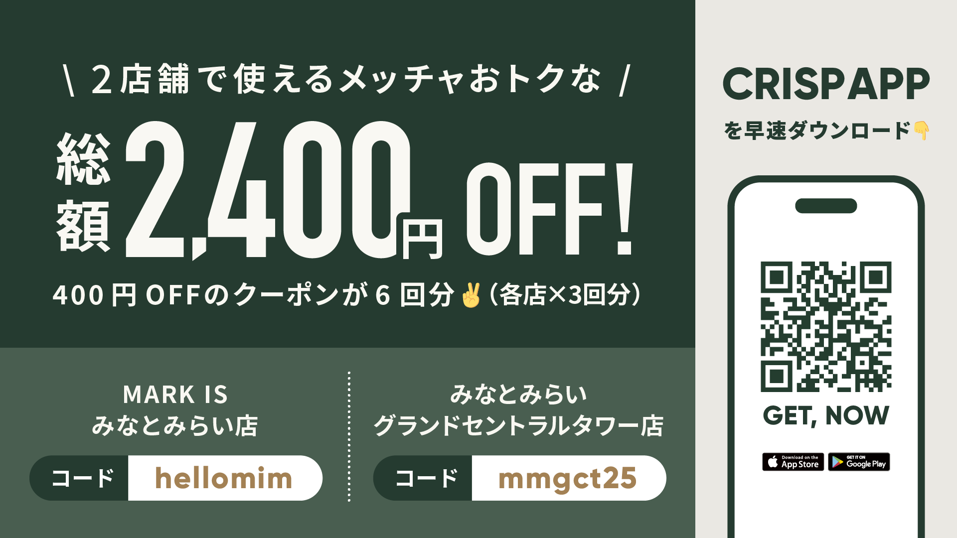 本キャンペーンでは、みなとみらいエリアでの2店舗目オープンを記念して、「MARK IS みなとみらい店」と「みなとみらいグランドセントラルタワー店」の2店舗で利用可能な総額2,400円OFFのクーポンを配布します。